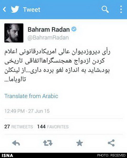 پس از اعلام قانونی شدن ازدواج همجنسبازان در سراسر ایالات متحده آمریکا، در خاورمیانه نیز برخی اشخاص واکنشهایی نشان دادند؛ بهرام رادان از جمله آنها بود که در یک توئیت تصویب قانون ازدواج همجنسگرایان در آمریکا را اتفاقی تاریخی و نوشته بود: «رأی دیروز دیوان عالی آمریکا در قانونی اعلام کردن ازدواج همجنسگراها اتفاقی تاریخی بود، شاید به اندازه لغو بردهداری... از لینکلن تا اوباما...»