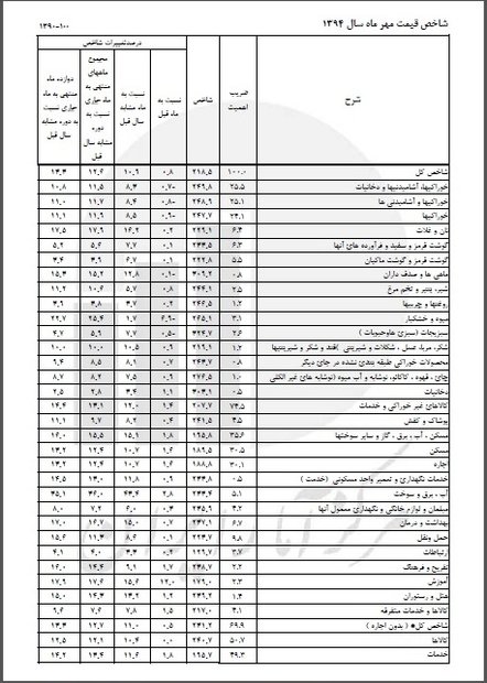 بررسی جزئیات شاخص قیمت ۳۱ گروه کالایی که مرکز آمار ایران آن را ملاک ارزیابی برای نرخ تورم قرار می دهد، نشان می دهد که تمامی ۳۰ شاخص در مهرماه روندی افزایشی داشته اند به طوری که شاخص قیمت خوراکی ها، آشامیدنی ها و دخانیات افزایش ۱۰.۸ درصد، نان و غلات ۱۷.۵ درصد، ماهی ها و صدف داران ۱۵.۳ درصد، شیر، پنیر و تخم مرغ ۱۱.۲ درصد نسبت به دوره مشابه سال قبل خود افزایش قیمت داشته اند.