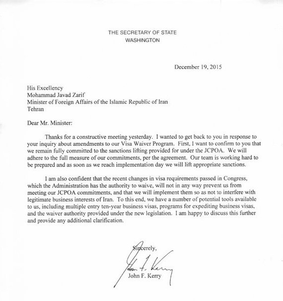 اینجانب همچنین اطمینان دارم که تغییرات جدید برای کسب روادید که در کنگره تصویب شده است، و دولت اختیار توقف اجرای آن را دارد، به هیچ وجه مانع ما نمیشود که تعهدات خود بر طبق برجام را اجرا کنیم، و ما [این تغییرات را] به گونهای اجرا میکنیم که هیچ مانعی برای منافع اقتصادی مشروع ایران ایجاد ننماید. بدین منظور ما بالقوه ابزارهای متعددی را در اختیار داریم، شامل [صدور] ویزاهای تجاری ده ساله چندبار ورود، برنامههایی برای تسریع در [صدور] ویزاهای تجاری، و اختیار توقف اجرای قانون که طبق این مصوبه جدید به ما داده شده است. خوشحال میشوم که در این خصوص باز هم صحبت کنم و توضیحات بیشتر ارائه نمایم.