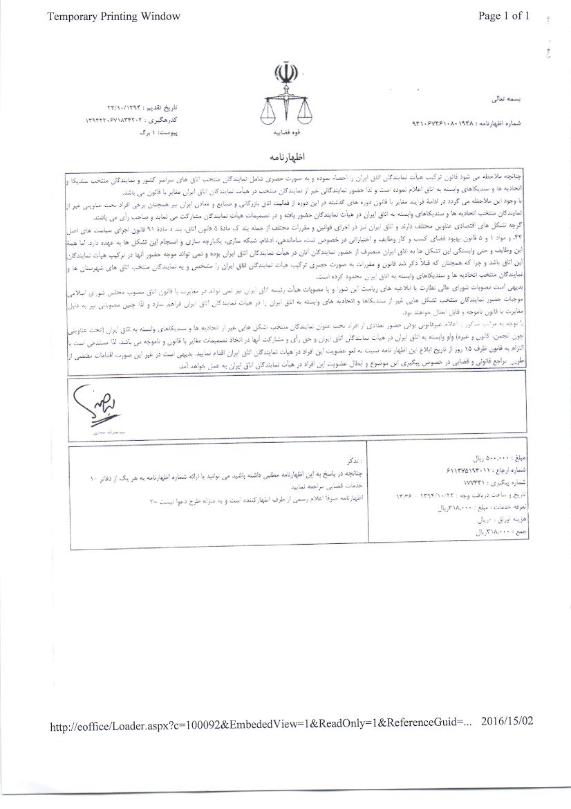 خانم «فاطمه دانشور» و آقایان «سیدحسین معروف» و «محسن چمنآرا» ضمن استناد به بند (ک) ماده 11 قانون اتاق بازرگانی، صنایع، معادن و کشاورزی ایران که صراحت بر حضور اتحادیهها و سندیکاها در ترکیب هیأت نمایندگان اتاق ایران دارد، از طریق یکی از وکلای دادگستری مبادرت به تقدیم و ارسال و ابلاغ اظهارنامهای به کلیه اعضای هیأت رئیسه کنونی اتاق ایران کردهاند. بر اساس این اظهار نامه با توجه به مشخص بودن عنوان تشکل هایی که حق حضور در هیأت نمایندگان را دارند حضور برخی از تشکل ها به ویژه تشکل هایی که اخیرا توسط خود اتاق بازرگانی ایجاد شده است غیرقانونی بوده و آنها به این رفتار اعتراض دارند.