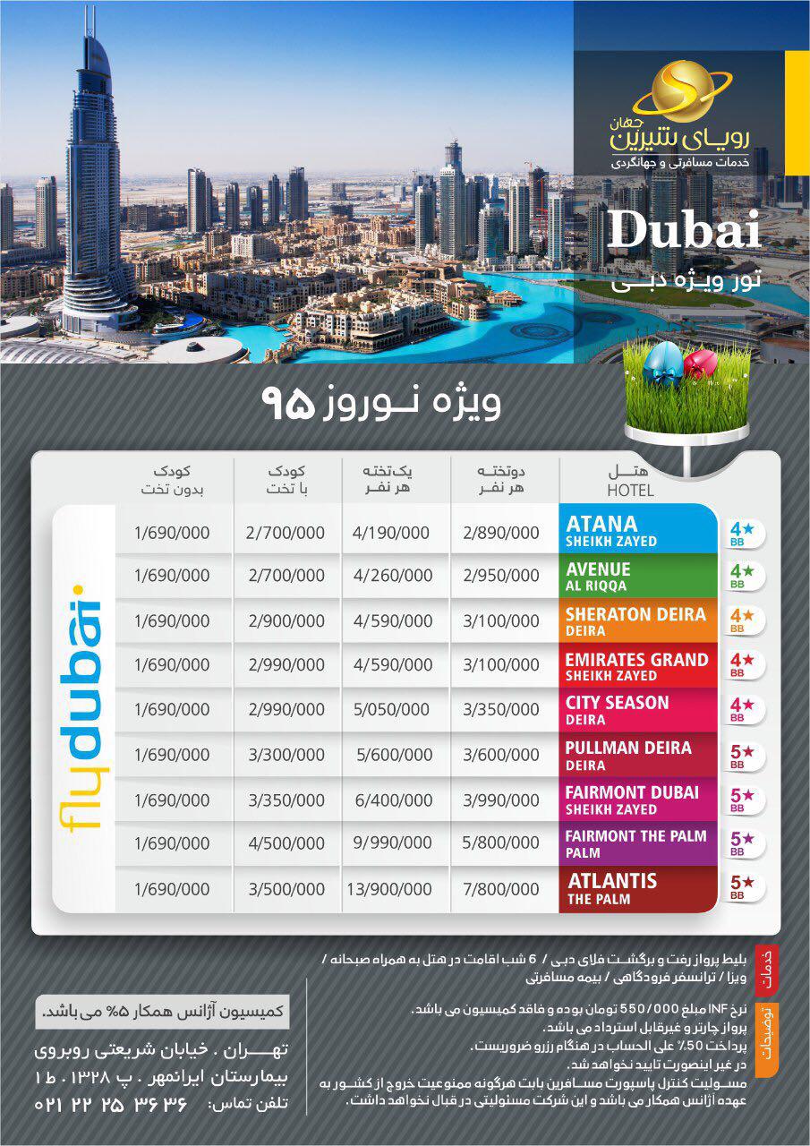 به گزارش اتاق خبر، آژانس مسافرتی رویای شیرین جهان ثبت نام تور دوبی را آغاز کرد که مشخصات آن به شرح زیر است: