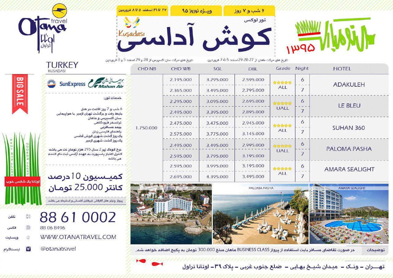 به گزارش اتاق خبر، آژانس مسافرتی اوتانا تراول ثبت نام کوش آداسی را آغاز کرد که مشخصات آن به شرح زیر است:
