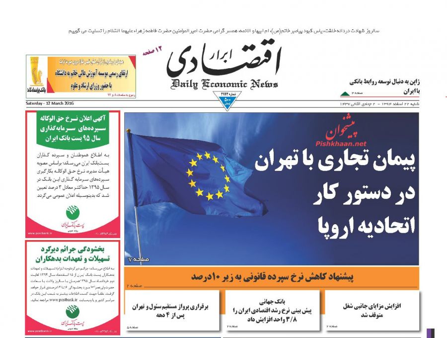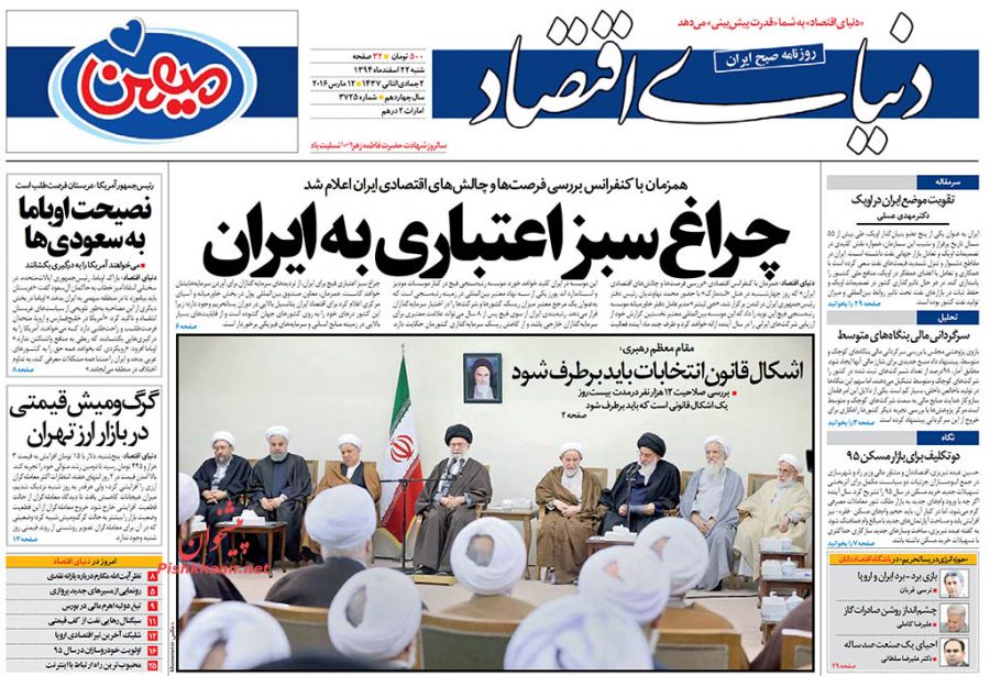 صفحه نخست روزنامه های اقتصادی ایران شنبه 22 اسفند 94