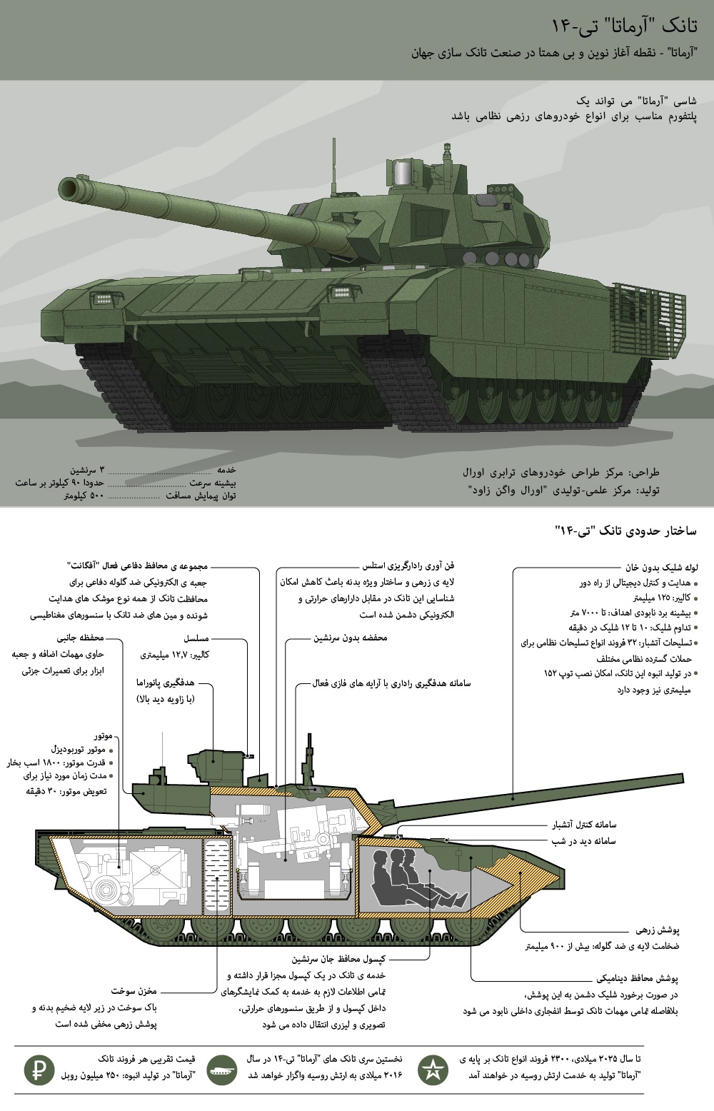اتاق خبر - وقتی در سال ۲۰۱۵ در جریان یک رژه از این تانک پیشرفته روسیه رونمایی شد بسیاری از کارشناسان غربی آن را در حدل مدل تحقیق و توسعه میدانستند. گزارشها اما اکنون نشان میدهد که خط تولید این تانک راه اندازی شده و قرار است تا سال ۲۰۲۰ حدود ۲۳۰۰ دستگاه از این تانک به ارتش روسیه تحویل داده شود. طراحی این تانک یک انقلاب زرهی در روسیه به حساب میآید.