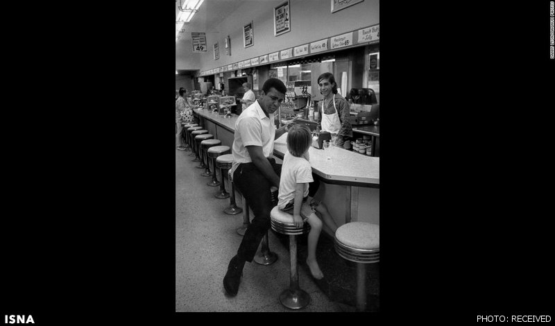 توضیح تصویر 1: محمد علی در یک رستوران در میامی. دنی لیون عکاس این عکس در آن سال سه روز را با محمد علی گذراند.