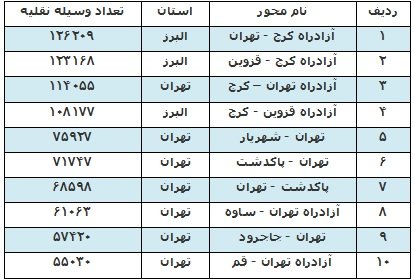 محورهای دارای بیشترین تردد طی ۲۴ ساعت گذشته:
