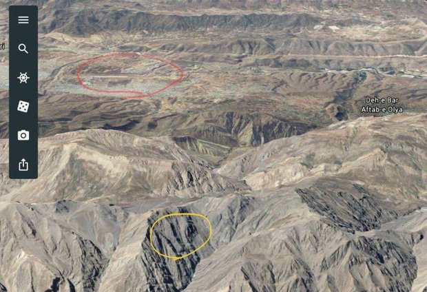دایره زرد، محل برخورد هواپیما و دایره قرمز، فرودگاه یاسوج را نشان می دهد
